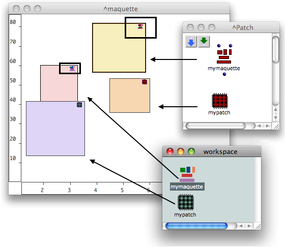 General and local patches or maquettes can be dropped in a maquette editor from the workspace or any other location. A reference to the patch, or maquette, is then created.