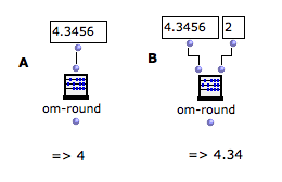 The standard use of OM-ROUND does not require using the optional inputs (A). In (B) we use the first optional ( decimals ) to round the input number whith a higher precision. | ![]() |