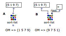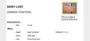 The default behaviour of the function sorts the numbers in ascending order (A). If we add the :test keyword input and change the test function, we can change this default behaviour. Here, the test function is changed for >, which outputs numbers in decreasing order (B). | ![]() |