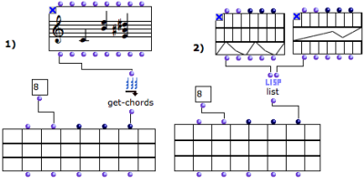 Objects, such as notes , chords , or any object in OM, can also be used for filling the matrix fields. These objects must be connected as a list to the class-array inputs.