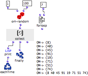 2. Om-random calculates a random number, which is printed at each loop by EachTime and print.