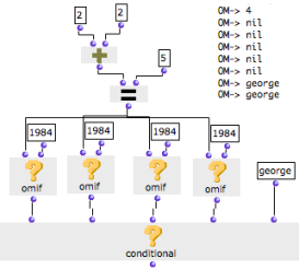 2. Every time, om= tests if 4 = 5, and returns "nil" to the omif boxes. One by one, they return "nil", because the condition to return "1984" is not fulfilled.