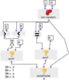 1. Om-random returns a number between 1 and 10. The box is on "evaluate-once mode" so that the same value is returned to all the other boxes at the evaluation.