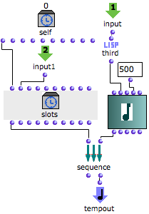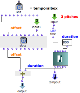 Note that the last TemporalBox has nor output, neither om+ function, but a sequence function. The box has nothing to return to another box. The sequence function allows to evaluate slots before evaluating the TemporalBox, so that its offset is correct.