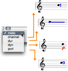 The staves configuration of notes , chords , chord-seqs and voices can be modified via a simple selection in the Staff pop up menu.