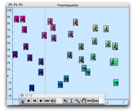 Most programming operations with the maquette take place in the maquette editor. As a graphic and temporal interface, the editor offers a number of options in relation with the interface appearance and the temporal and metric structure of the maquette. In addition, a palette and a player allow graphic manipulations and of course, to play the maquette.