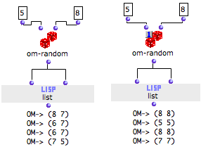 In the example below, the output of om-random is connected to the two inputs of list. In both cases, om-random returns a different value every time is is called. But :