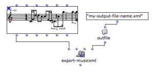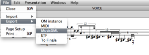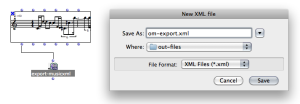 Exporting OM score objects as external files can be done from the boxes' contextual menu, from the score editors (menu File / Export) or using the dedicated boxes in a patch from the Functions / Score / Import/Export menu.