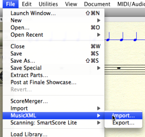 To import an XML file in Finale, you can choose MusicXML in the Import File menu of the opening dialogue window, or use the File / MusicXML / Import menu in any Finale window.