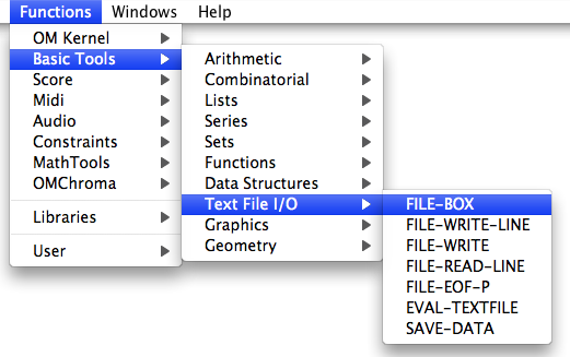 The File-Box is an extension of OMLoop used for programming iterative processes while controlling file reading and/or writing operations. These operations can be executed with several functions from the Files package .