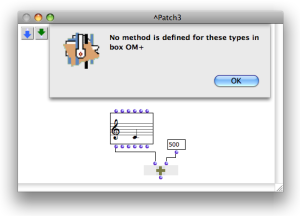 In this example, we want to transpose a chord using OM+. To execute an operation, a function must apply to the right argument : the relevant output must be connected to the function. No method is defined in OM+ for arguments of type chord, so the "self" (1st) ouput of the chord box can not be connected to this function box. The "pitch" output (which returns a list of numbers) should be connected instead.
