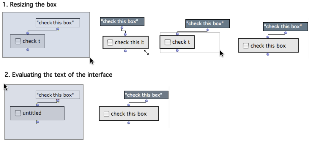 Most interface boxes have a display text, generally as a first input. The text connected to the input is displayed on the interface when the box is evaluated (if not in locked mode).