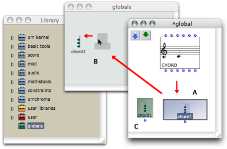 Like an instance box, the global variable box appears without inputs. Parametric values of global variables can be accessed and modified via a specific type of box : the slots box.