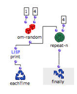 We want to generate four random numbers between 1 and 4. Instead of using forloop to define the number of steps of the iteration, we have used repeat-n : OMLoop will never end and generate four random numbers an infinite number of times... | ![]() |