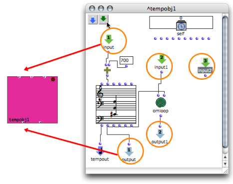 Note that, as in any patch, inputs and outputs are represented by the same arrow icons, and are connected exactly the same way to the boxes of the patch editor.