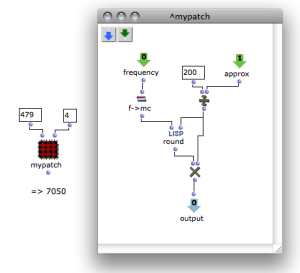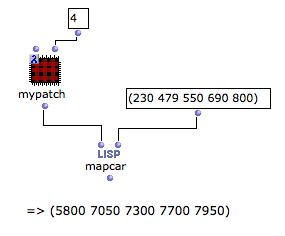 The same patch box can be used on lambda mode with mapcar in order to process a list of input values. Mapcar applies a function to the items of one or more lists, successively. | ![]() |