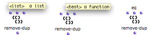 The new test function can now become the test argument and replace the defautt eql test of remove-dup .