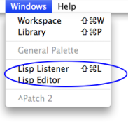 ![]() | OM has two main interfaces to Lisp : The Listener[1] window and the Lisp editor. These two windows are accessible from the |