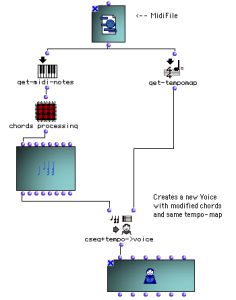 In this example, notes and tempo map are extracted from a MIDIFile (could be from a voice, for example). Notes are processed as chord-seq and then re-written in a voice using the initial tempo and metric informations. However, tempo information is used with some limits :