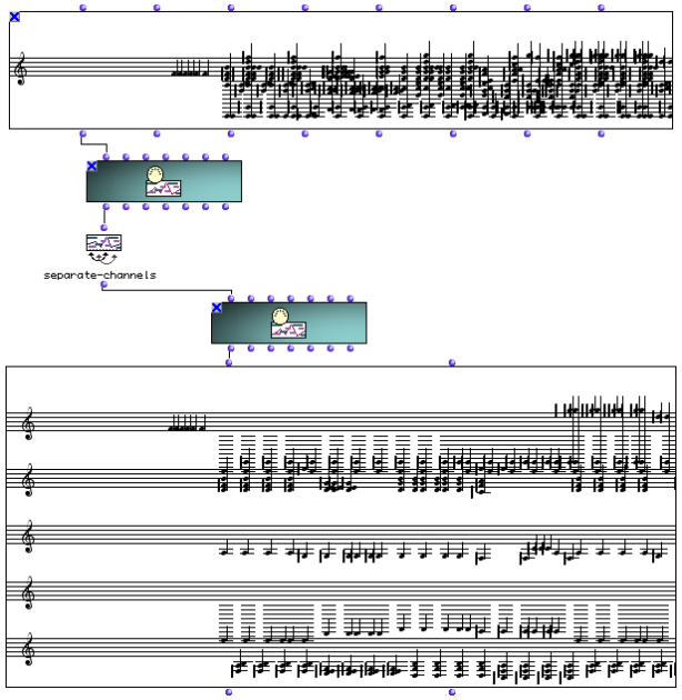 The function separate-channels processes all Events of the EventMidi-seq and put each channel on a diferent track. In the following example, we separate notes of different channels in a chord-seq into diferent multi-seq tracks via MidiEvents processing. | ![]() |