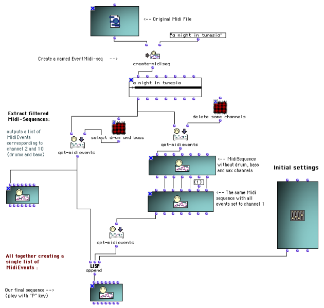 In this example, MidiEvents are extracted from a MidiFile, and then filtered to separateand process channels. The resulting sequences are put in a new EventMidi-seq with a midi-mix-console object to add the initial settings events to the sequence.