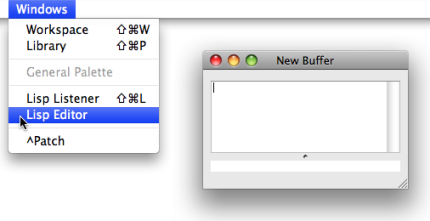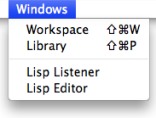The Workspace and the Lisp Listener appear at the start of a session. | ![]() |