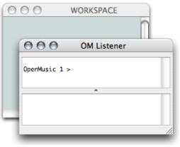 ![]() The OM+ box performs an addition, whose result is given in the Listener. | The Listener is a Lisp communication interface : results of computations, warnings or error messages are displayed there. It also allows to send commands to OM, in other words, to evaluate Lisp expressions. User inputs are typed and interpreted in the upper part of the Listener window. Output messages are printed in the lower part of the window. To open or show a listener window :