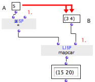 Mapcar goes through the list (B) and applies (A) to each of its items successively. Results are collected and returned as a list :