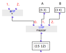 The * function is connected to input #0. It is applied successively to the first elements of inputs #1 and #2, then to the second elements of inputs #1 and 2, then to the third elements, and so on. A list is built a out of the successive results.