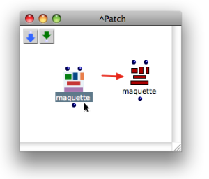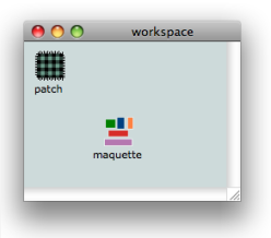 Once a maquette is added in a workspace, it can be dropped in a patch, on the same basis as an abstraction : like a "global" abstraction, or blue patch, the maquette keeps it original reference, which means any modification will affect all of its representations.