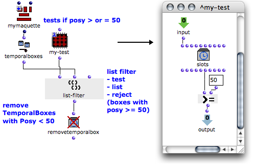 The slots box represents a TemporalBox, whose "posy" output is connected to the >= predicate. The test argument tests if the "posy" of a TemporalBox is superior or equal to 50.