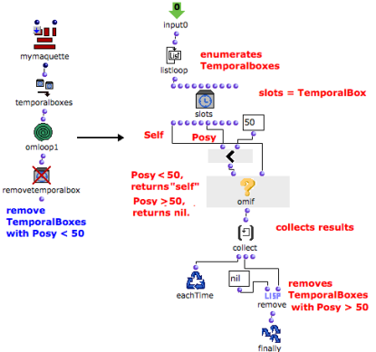 In both cases, when evaluated, removetemporalboxes removes all the items of the list from the maquette, that is, all the boxes whose "posy" is inferior to 50.