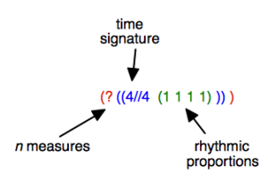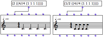 | ![]() Here, the (1 1 1 1) sub list represents four equal subdivisions of a 4/4 measure. OM calculated that the tree has two measures. |