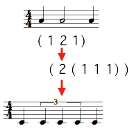 This one measure tree has one group – two quarter notes – , one group with a sub group – one eighth note and a sixteenth notes triplet, and a last group – a quintuplet.