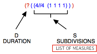 Traditionally, rhythm is broken up into several data : meter, measure(s) and duration(s). Rhythm trees must enclose these information in lists and sub list.