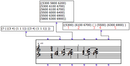 For instance : (1 (((4 4) (1 1 2))) is a rhythm of one measure, signature 4/4, with two quarter and one half note (proportions = 1/4 1/4 2/4 = 1/4 1/4 1/2).