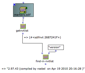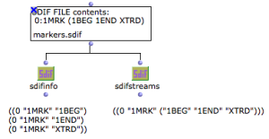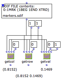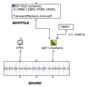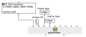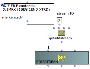 SDIF->MARKERS extracts the time values of marker frames and returns them as a simple list of values in seconds. This list can for instance be connected to the markers input of a SOUND object, containing the original sound file.