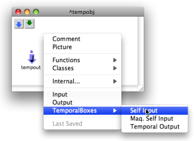 | A Self Input box can be added in a patch, to apply or control the characteristics of a Temporalbox from the very inside of the patch . Consequently, the Self Input box is only useful if the patch is represented in a maquette. |