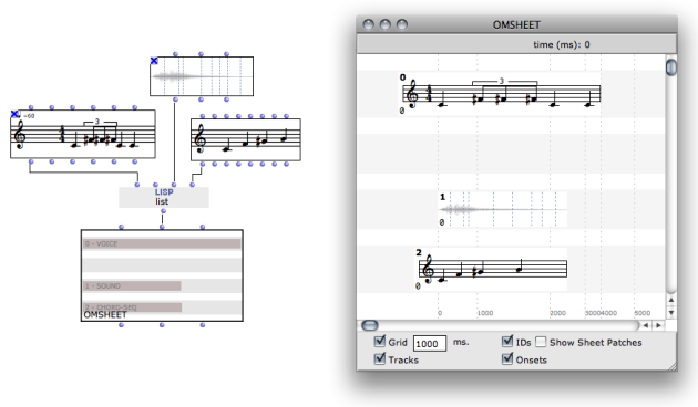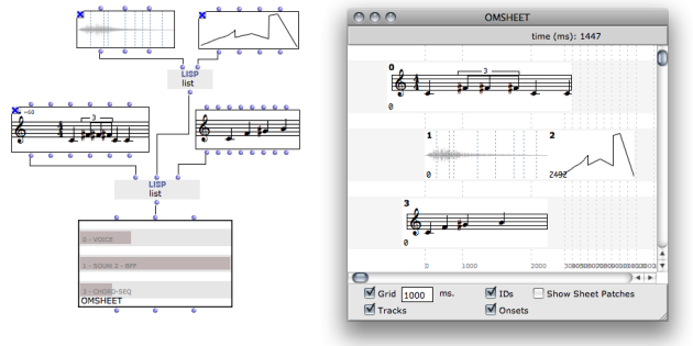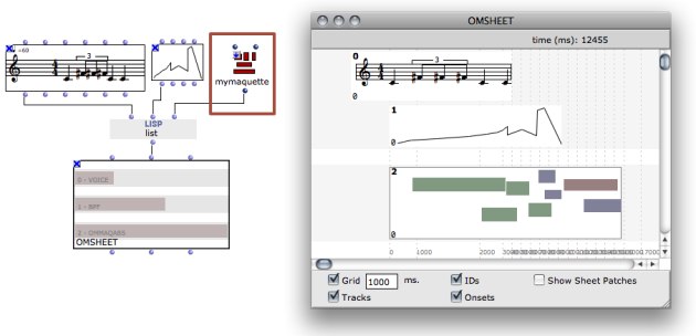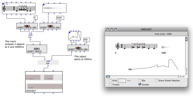 For a more accurate control of the sheet structure (and in particular of the temporal structure), the internal components of the sheet can be created and assembled directly in the OM patch. The classes SHEET-TRACK and SHEET-TRACK-OBJ can be used for this purpose.