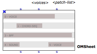 An OMSheet has also a number of attached inbuilt patches (<patch-list>) allowing to generate the contents or link the sheet track objects together.