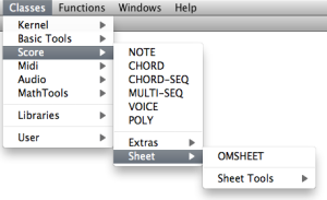 The OMSheet object is a special polyphonic container allowing to bring together heterogeneous musical objects on its different voices. The OMSheet editor has specific features ensuring space/time alignments between the notation and other temporal objects.