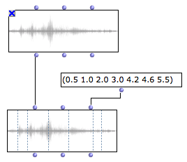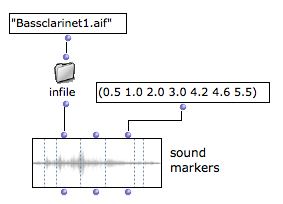 Markers are simple time values expressed in seconds. They can be set manually (as a list), algoritmically (if they come from other patch boxes) or using the sound editor.