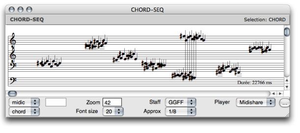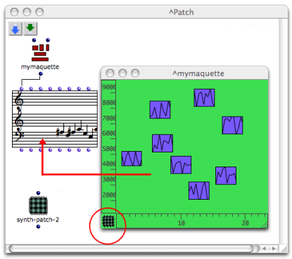 Once the maquette is evaluated, the result of the synthesis can possibly be visualized with a chord-seq box connected to the maquette's output. When the maquette, or a selected TemporalBox is played, it renders the interpretation of its values by the synthesis patch.