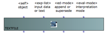 It allows to set or read the contents of the textfile box within visual programs. The implementation and interpretation of the content depends on the "eval-mode" and "ed-mode" inputs settings.