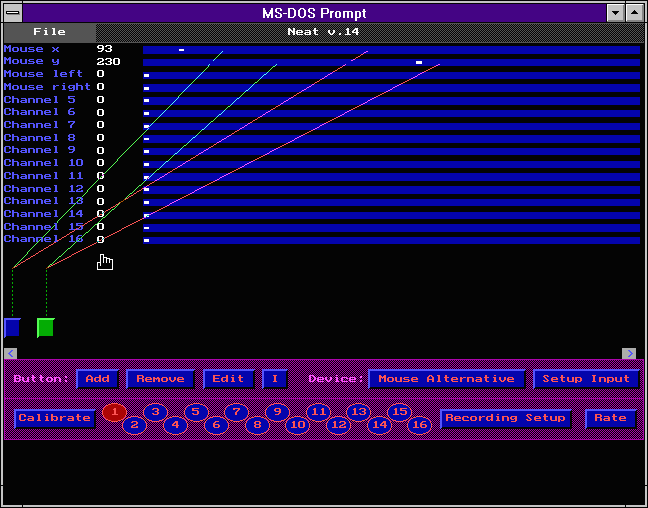 通过对通道进行校准为幅面不同的信号选择合适的窗口,鼠标拖动和点击时设定的绿线和红线设置了边界的上下限.当一个信号出现在此范围内,按钮由蓝变成绿,并相应地控制一个二进制代码的输出设备