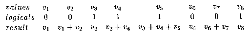 例4.22: 本例用一个用户自定义的操作进行段扫描,一个段扫描将一组值和一组逻辑量作为输入,其中逻辑值将输入分割成不同的段.例如对于以下数据: