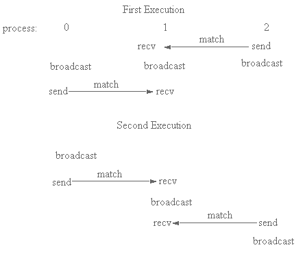 图4.10: 发送与接收之间非确定性匹配.不应当依赖广播中的同步来保证程序的确定性