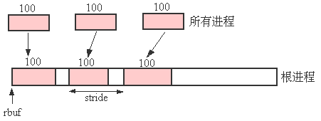 图4.3: 根进程从组中的每个其他进程收集100个整型数据,每个数据集之间按一定步长分开存放
