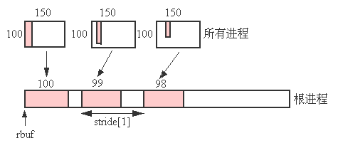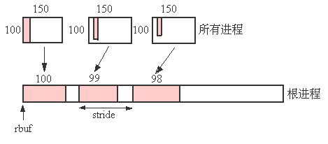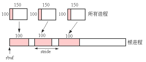 图4.5: 根进程从100*150的数组中收集第i列的100-i个整型数据,每个数据集之间按一定步长分开存放