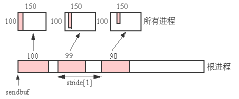 图4.9: 根进程分散100*150数组的第i列中100-i个整型数据块.发送端的步长分别为stride[i]